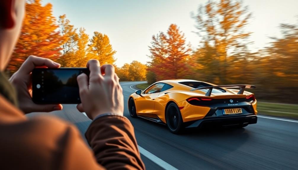 To freeze car action on mobile, you'll need to master a few key techniques. Start by using fast shutter speeds in your phone's pro or manual mode, aiming for 1/500th of a second or faster. Try panning, where you move your camera with the car to keep it sharp while blurring the background. Burst mode can help capture the perfect moment by taking multiple shots rapidly. Anticipate the car's movement and position yourself strategically for dynamic shots. Specialized camera apps can offer advanced features, while post-processing allows you to enhance motion effects. These methods will set you on the path to capturing stunning automotive action.