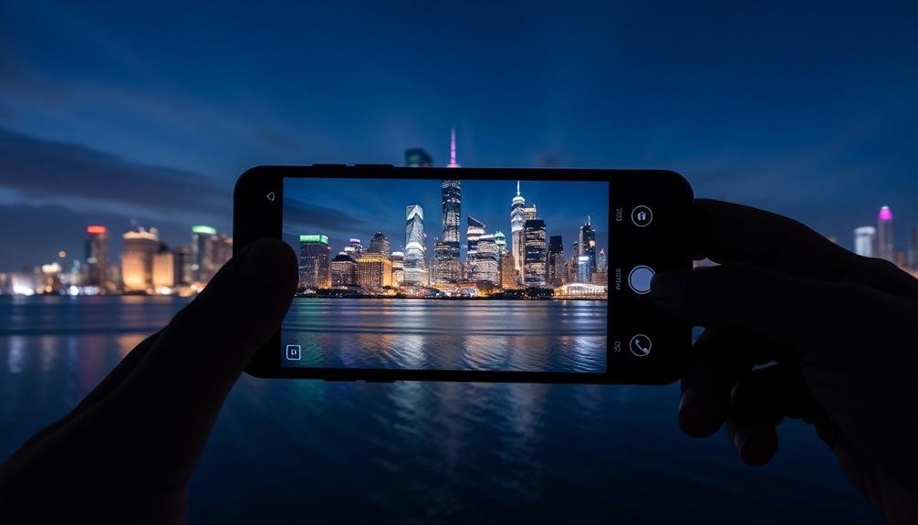 Great night panoramas on your phone start with a steady hand and proper technique. You'll want to use Night Mode and adjust exposure settings to capture more light in low-light conditions. Composition is key, so look for interesting elements like city skylines or landmarks to anchor your shot. Use leading lines and the rule of thirds to create a balanced image. Don't forget to stabilize your phone with a tripod or stable surface for sharper results. Post-processing can enhance your panorama by adjusting contrast and reducing noise. With the right timing and subject selection, you'll be on your way to capturing breathtaking nighttime vistas.