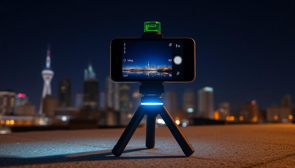 These versatile devices guarantee your phone camera is perfectly aligned, eliminating tilted horizons and skewed compositions. You'll appreciate their portability, as they easily fit in your pocket or camera bag, making them ideal for spontaneous night shoots.