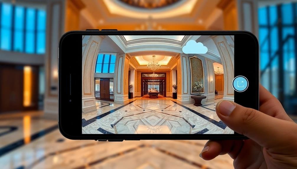 To create professional virtual tours with your smartphone, start by equipping yourself with essential gear like a tripod and wide-angle lens attachment. Master your phone's panorama mode settings, focusing on exposure, white balance, and overlap. Compose your shots thoughtfully, framing key focal points and maintaining a consistent eye level. For 360-degree panoramas, use specialized apps and capture techniques to guarantee complete coverage. Edit and stitch your photos carefully, then host your virtual tour on platforms like Google Street View or Matterport. By applying these pro techniques, you'll craft immersive experiences that engage and inspire viewers. Dive deeper to access the full potential of smartphone panoramas.